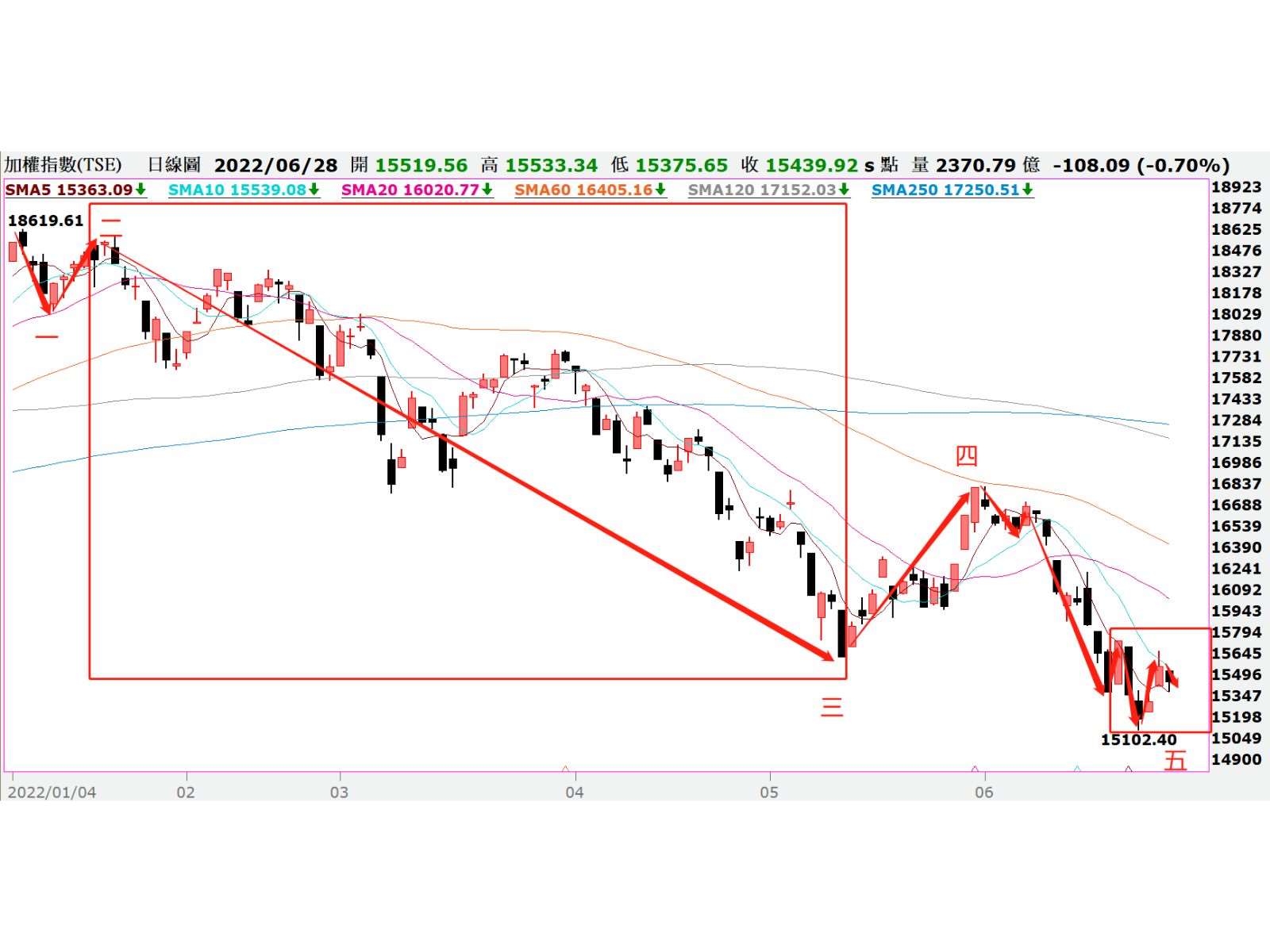 短線上從5/31的16807高點拉回到15102低點,研判可能屬於五-4波的弱勢反彈格局,就波數上還欠一個低點測試(另需觀察是否有延伸波出現)。