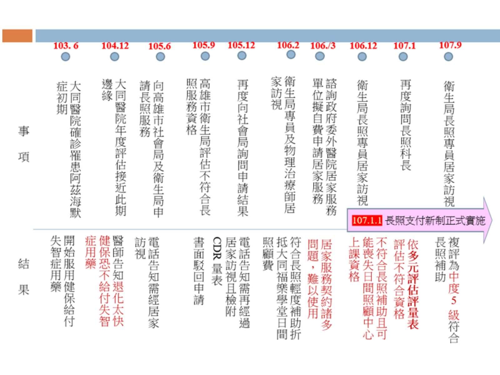 筆者個人幫失智母親申請長照資源的過程坎坷如附表。這樣的艱辛過程,已有改善,但仍可以更好。去年一位社會福利科系背景的照顧者B,幫其早發性失智且獨居的長輩申請長照資源過程中,面對失智長輩多變的病情,心情焦慮不安,大病小病不斷,而「個管師」還希望她將長輩帶到台北安置,但是北漂租屋工作的她,根本無法帶著失智長輩北上同住而能兼顧工作,再加上長輩常以死要脅,使她方寸大亂,不得不暫時中斷職場。