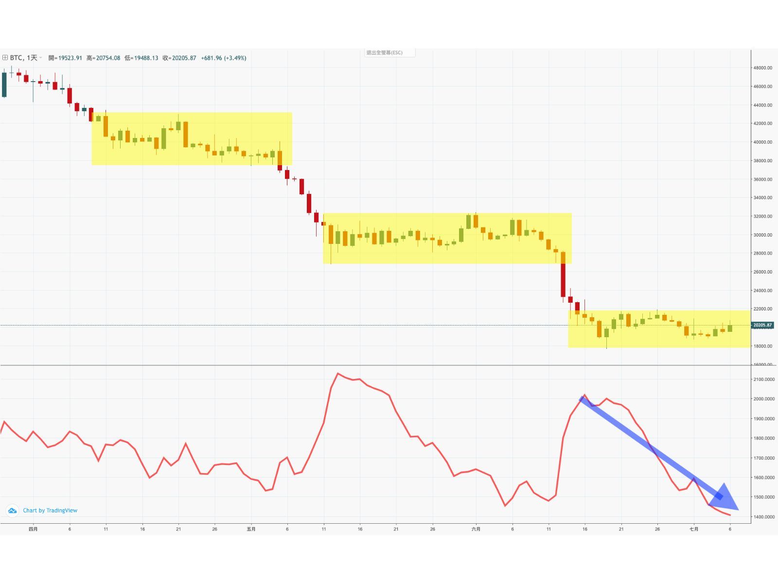 最後從技術面來觀察,即便市場上仍有利空消息,但近期比特幣價格已穩定落在一萬八至二萬一的區間內狹幅整理,代表利空消息已逐漸鈍化,加上幣價的波動已來到相對低檔,將有助於走勢逐漸穩定下來。