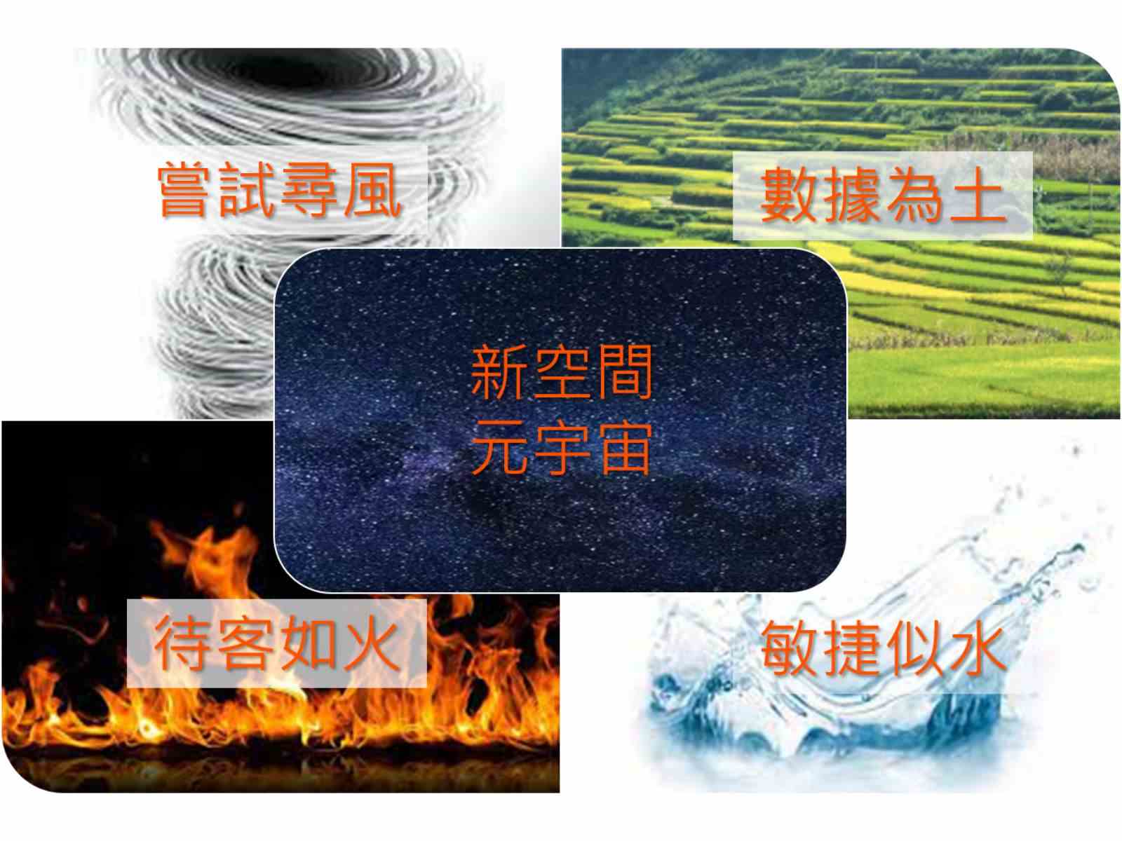 這四大心法元素分別為「數據為土」、「敏捷似水」、「待客如火」、「嘗試尋風」。