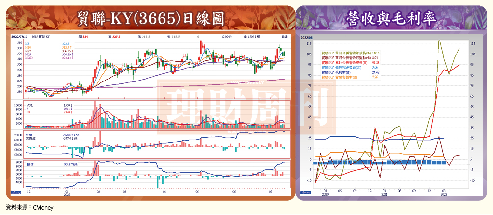 貿聯-KY表示,歐洲俄烏戰爭、全球通膨升息等背景環境持續影響下,公司審慎關注整體需求會否受到影響。不過,貿聯-KY旗下產品組合明顯分散,較不會受到消費性產品、單一產品需求降低嚴重影響,以各通路、公司內部評估結果,工業半導體設備、伺服器應用板塊表現仍佳,下半年營運與公司原本預估結果並不會差距太多,展望結果仍屬審慎樂觀,應有望順利達成原本訂定下半年及全年度營收目標。