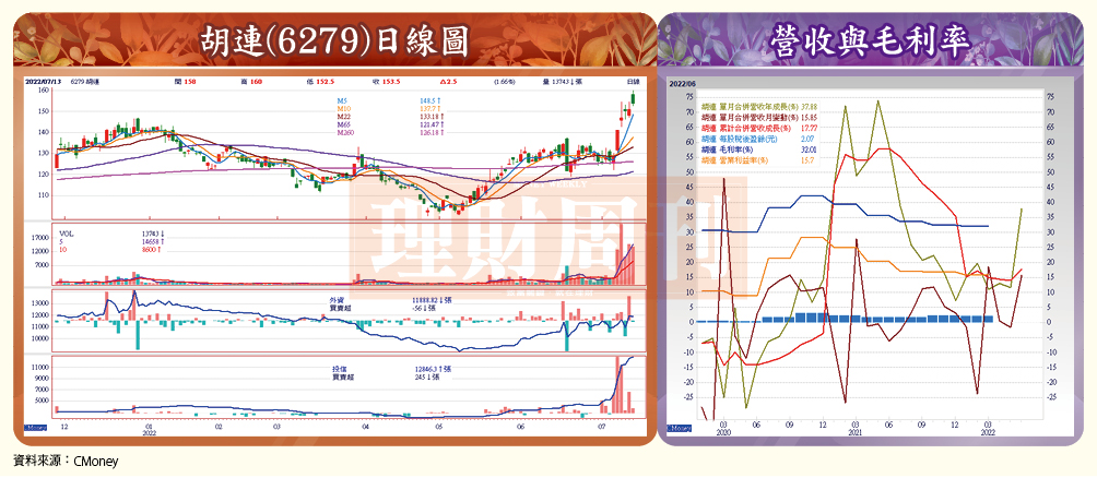 胡連因成功搭上政策振興車市題材,與大廠合資所公司效益將陸續顯現,市場法人看好下半年營運有望不淡。由於營運展望不差,胡連近期股價較不受大盤重挫影響,維持相對高檔位置。