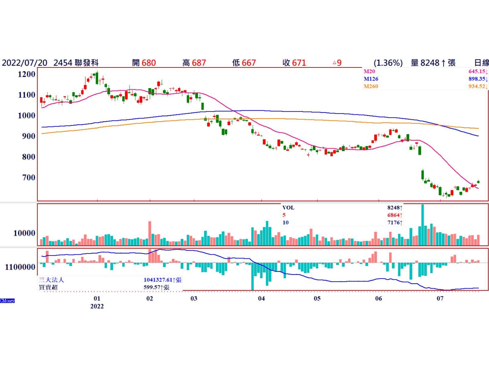 聯發科去年封關收盤1190元,7/20股價671元,總市值減少8299億,外資持股仍高達61.73%,今年帳上損失高達5123億元,所以下半年外資有可能強力作價來弭平帳上虧損,可以特別注意。近期聯發科晶片也打入蘋果供應鏈,未來是否會有更多合作機會值得注意。