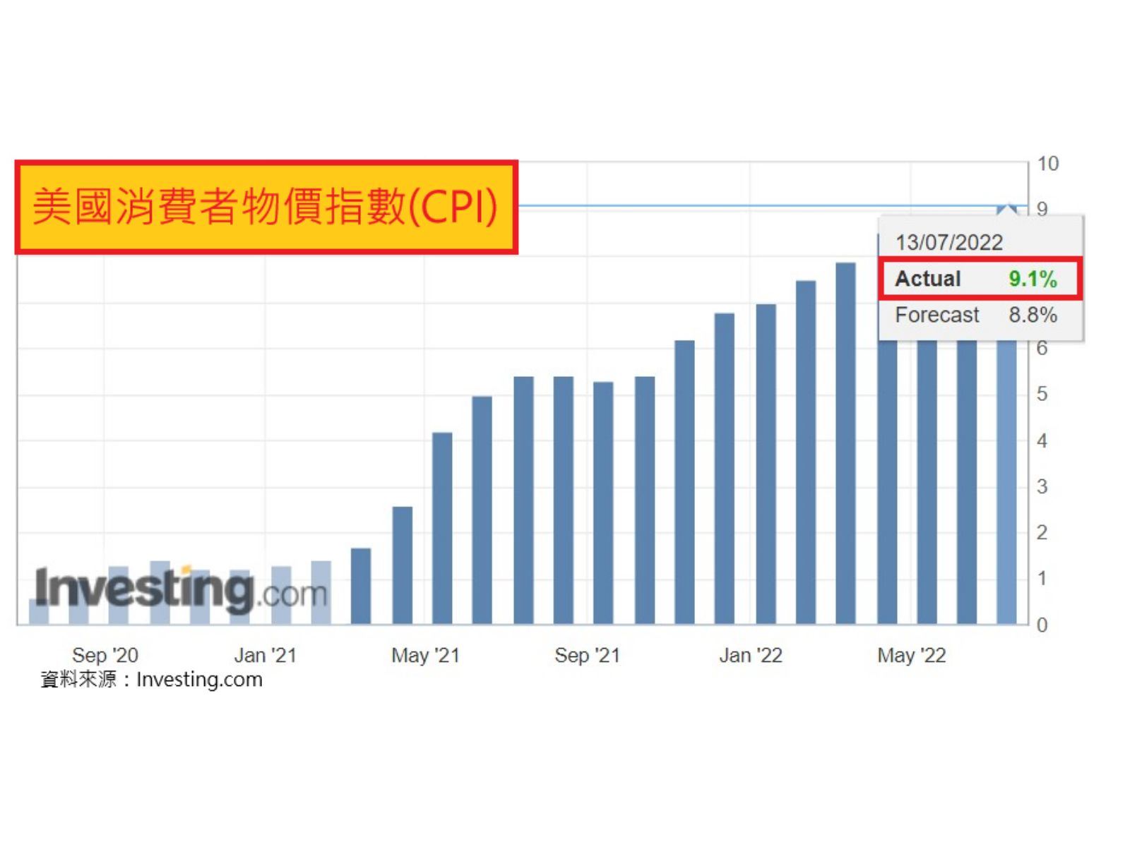 美國六月消費者物價指數(Consumer Price Index, CPI)年增9.1%高於預期值8.8%(詳圖一),且美國六月生產者物價數(Producer Price Index, PPI)年增11.3%亦高於預期值10.7%(詳圖二),因此市場投資人推測7/27聯邦公開市場委員會(FOMC)會議升息四碼的機率大增,然而近期美國Fed官員無論鷹派或鴿派紛紛表態,暗示7/27升息三碼(75個Basis point)已足夠,促使市場恐慌程度漸消退。