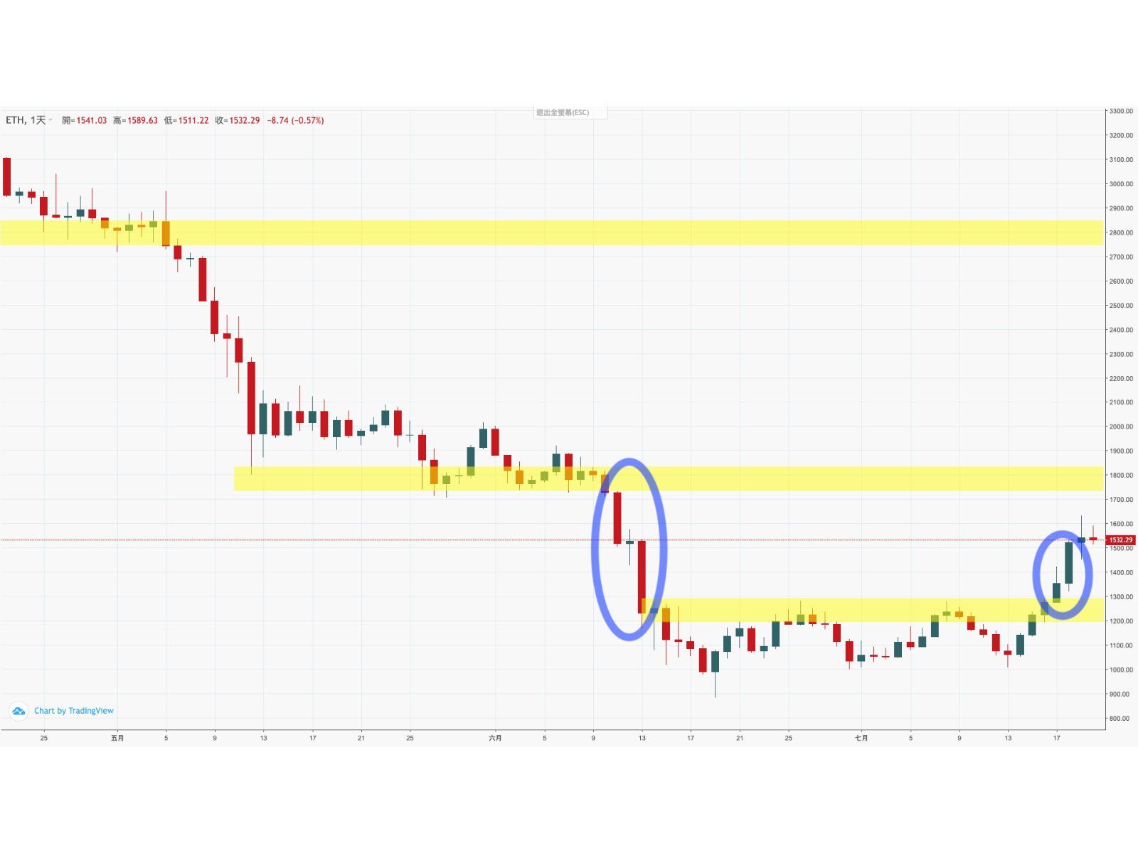 不過目前ETH強勁反彈走勢,即將面臨前波整理區壓力的1800,套牢賣壓與買盤的對抗預期會對價格帶來一段震盪期,待賣壓消化完畢後,便有機會靠著減產的基本面利多進一步走高。