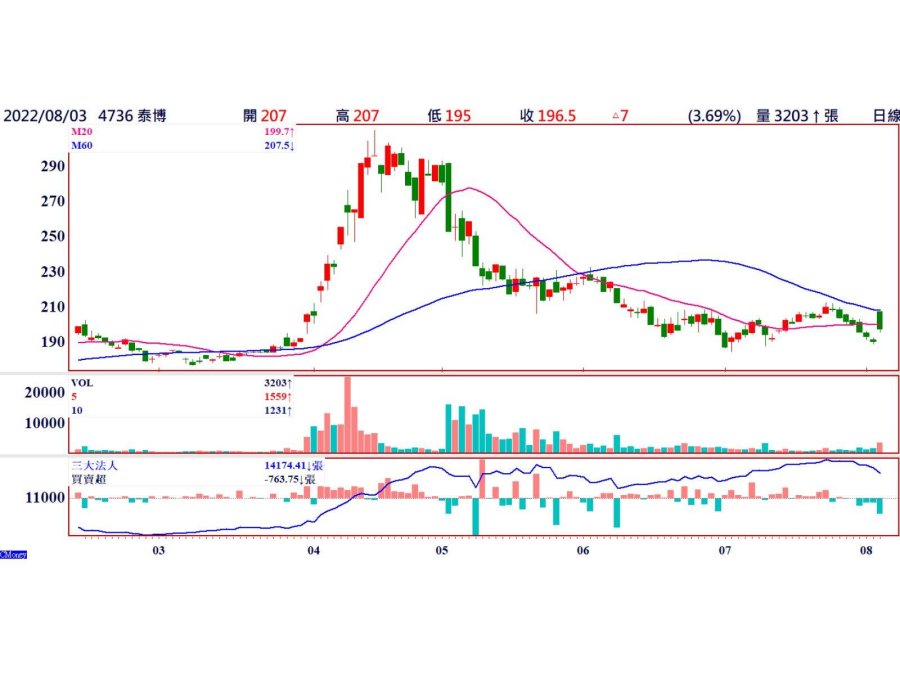 近期台灣疫情獲得控制,但是新的變種病毒造成國際確診人數又快速攀升,台灣疫情隨時再升高的機會很大,快篩試劑需求還是很重,泰博8/14除息15元。