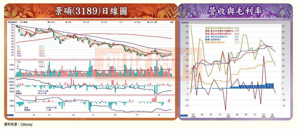 美系外資日前曾出具看好景碩後市的研究報告,看好先進封裝、高效運算(HPC)市場板塊成長動能,將驅使ABF載板今、明二年的市場供給持續吃緊,而景碩因股價估值低、獲利成長動能較強,加以PCB業務的停損,有助於提升毛利率水準,成功抵銷營收減少的營運衝擊,因而先前即給予其「買進」投資評等。