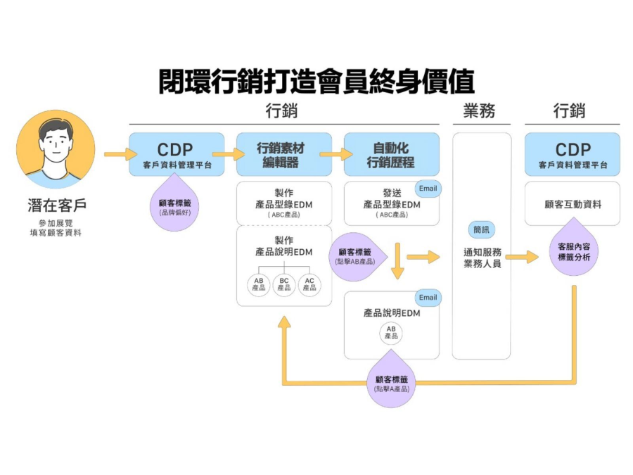 這一連串的消費旅程可藉由CDP收集資料、行銷素材生成器與行銷自動化工具,藉由貼標管理潛在、忠實、沉睡客戶,並提供不同時間節點的自動推播,以客服系統記錄顧客訊息,建立循環永續的顧客價值。