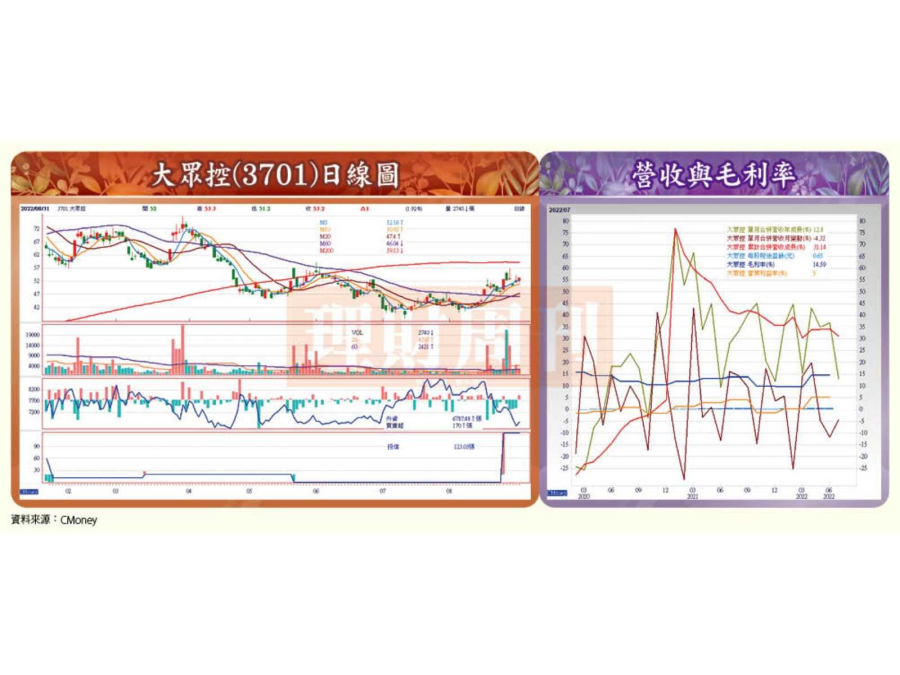 轉向汽車前裝電子設計製造及智慧城市能源監控管理布局的大眾控(3701),為華為3D AR-HUD產品的主要代工廠,隨著全球最先搭載華為3D AR-HUD產品的中國新款電動車飛凡R7 將於九月上市,該產品已開始生產出貨貢獻大眾控營收,接下來就觀察飛凡R7 銷售量及搭載華為產品的車款增加速度。