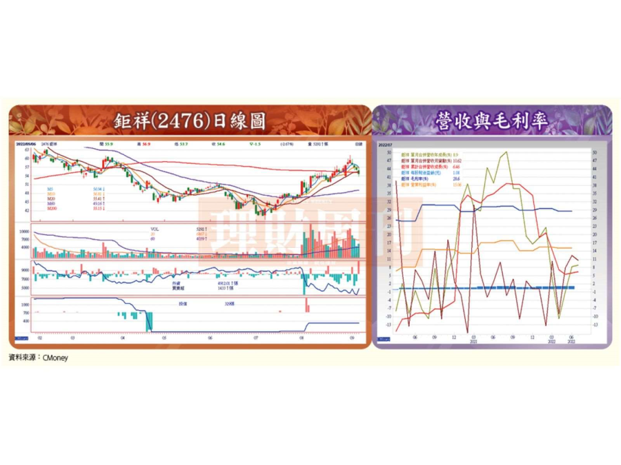 鉅祥七月營收成功創下歷史新高,單月營業收益亦見到正向增長。鉅祥主要供應金屬沖壓件產品,自3C產品轉型至汽車、醫療、家電等高附加價值產品線持續發展。公司於車用產品領域已耕耘多年,每年營收貢獻持續穩定成長,車用營收占比約一六%至一七%,預估在車用產品出貨持續增加之下,車用板塊今年營收占比將可超越二○%水準。全球車市今年持續吃緊效應挹注下,市場正面樂觀看待鉅祥後續營運表現。