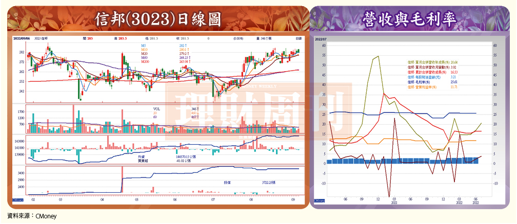 法人機構表示,信邦主要業務成長動能來自於車用、工業、醫療、綠能等產業板塊貢獻,故受到消費性電子市場需求下滑影響程度相對小,加以傳統旺季到來,預期公司第三季營收將可順利維持季成長佳績,有望挑戰續創單季新高紀錄。