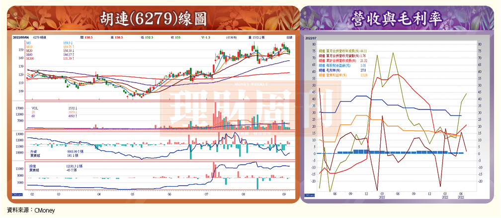 美系、亞系外資最新研究報告,同步看好胡連後市。其中,亞系外資表示,進入今年下半年之後,預計受惠中國刺激車市消費政策推動效應之下,整體銷售勢將有所改善,胡連電動汽車客戶所進行眾多發展計劃,和不斷增加的營收貢獻,以及成本壓力出現緩解下,營運優勢將於二○二三年進一步發酵。伴隨公司研發努力持續取得成果,以及新客戶貢獻度越來越高,因此調整二○二二年到二○二四年每年EPS,成長一一%至一五%,給予「買進」評等,目標價自一五五元上調至一九○元,美系外資給予「建議買進」評等,目標價為一八○元。