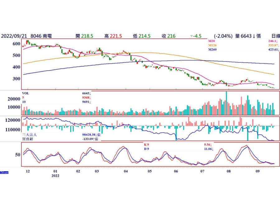 南電表示,目前營運產能滿載,下半年獲利會比上半年更好,全年EPS估計將達28元以上,年成長70%,再寫新紀錄。股價卻由去年12月631元盤跌至今214元,跌幅高達66%,本益比由38倍壓縮剩七倍,目前日線KD指標已經到嚴重超賣區(9,11),隨時有強力彈升的機會。