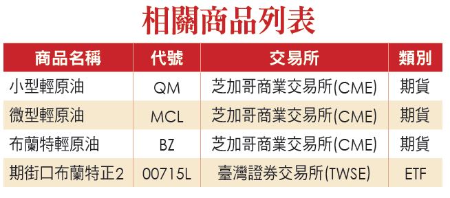 近期股市波動加劇,許多投資人操作上不若過去順遂,不妨換個角度,從具有較明確趨勢的原油市場入手,或許會較有方向感。具體交易商品,可參考芝商所(CME)小型輕原油期貨、微型輕原油期貨及布蘭特原油期貨。若偏好低槓桿,也可參考連動布蘭特原油的期街口布蘭特正2(00715L),把握近期油價回跌的進場時機!