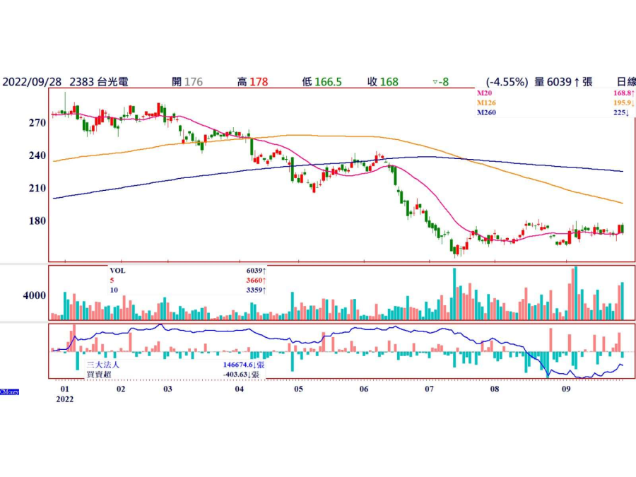 台光電今年股價最高298元,經過半年盤跌至最低145元股價腰斬,最近三個月都維持在150~180元間底部震盪,尤其加權指數由八月15475點跌到13466點,台光電逆勢上漲抗跌很強,投信連續兩個月不斷加碼買進累積超過一萬張,未來只要底部頸180元突破,就會有新的多頭行情發動。