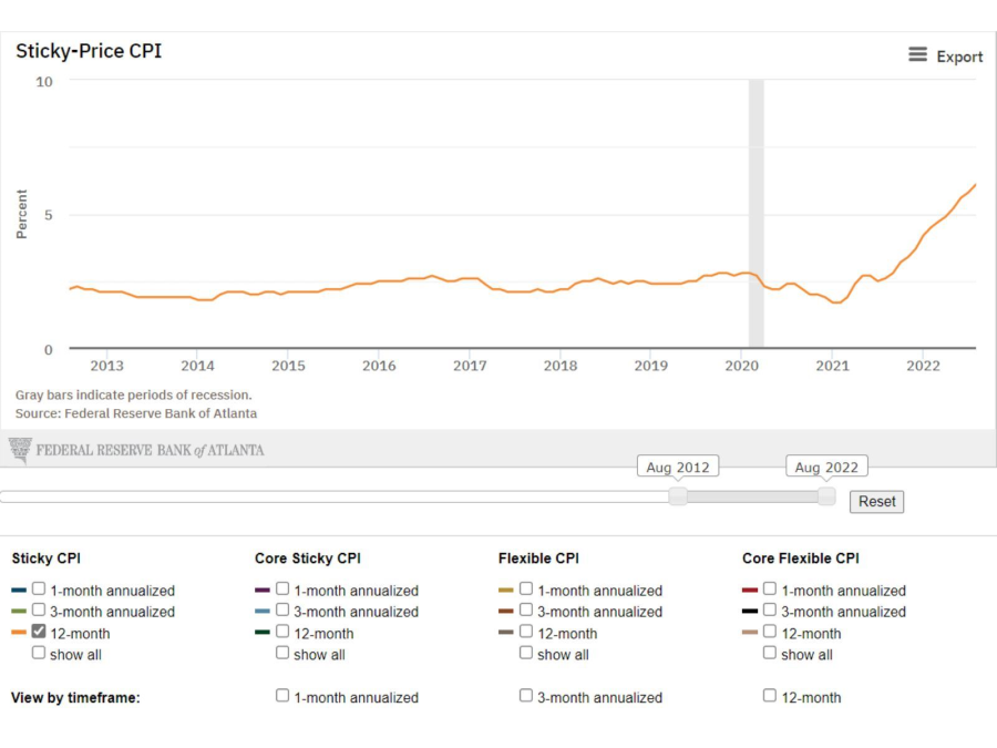 從亞特蘭大聯準會的Sticky-Price CPI,可以看到美國的惰性物價(例如住房租金、醫療保健、教育、家用家具)明顯上漲,在七月份上漲5.4%之後,八月份上漲了7.7%(按年化計算)。與去年同期相比,該系列增長了6.1%。