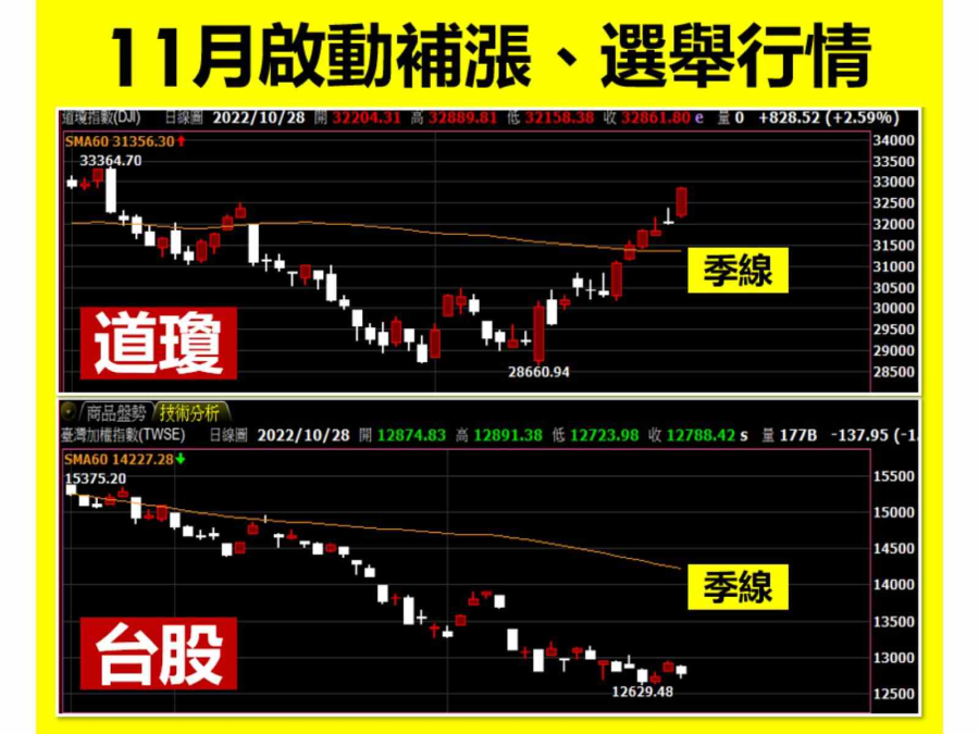 以道瓊為例:10月13日見到波段低點,到10月28日波段上漲14.8%,美國期中選舉是11月8日,拜登民調跌到39%,接近任內史低36%,市場預估民主黨可能丟掉參、眾兩院多數,可能衝擊剩下兩年任期的施政,想當然在選舉最後階段當然奮力一擊,端出各種牛肉拚經濟。