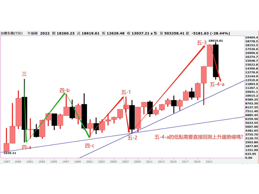 有爭議的部分可能是1990~2001年這段整理波,是要定位在長線第四波?還是主升段延伸波的第二波整理?以台灣在九○年代之後轉型發展為科技島,半導體經過這三十年來發展,以台積電為首的半導體聚落成為台股市值最大族群,基於台積電二奈米先進製程量產時間為2025年,日前又傳出為一奈米建廠尋地,照理說今年的18619高點應該是第三浪的主升段位階。也就是說,單就科技發展層面來看,如果沒有政治力干擾的話,從2001年3411低點起漲的多頭,應當視為第三浪的主升段的延伸。
