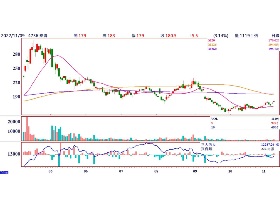 十月營收9.1億,月增44%,年增127%。泰博股本9.3億,屬小型籌碼股,公司董監事大股東持股高達50%,籌碼集中容易炒作。今年四月疫情爆發下股價一度大漲至310元,之後又跌回154元,近期股價開始回升,以十一月九日收盤價180.5元計算,本益比只有四倍,股價嚴重低估,具長線投資機會。