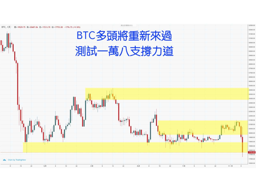 回到幣市觀察,BTC再度回到第二、三季整理平台,目前在一萬八位置有撐,不過現在談低接還太早。現階段市場會以消息面為主,在FTX事件穩定下來後,市場才有機會去發展趨勢性行情,在此之前還得重新經歷區間震盪、築底整理的階段。