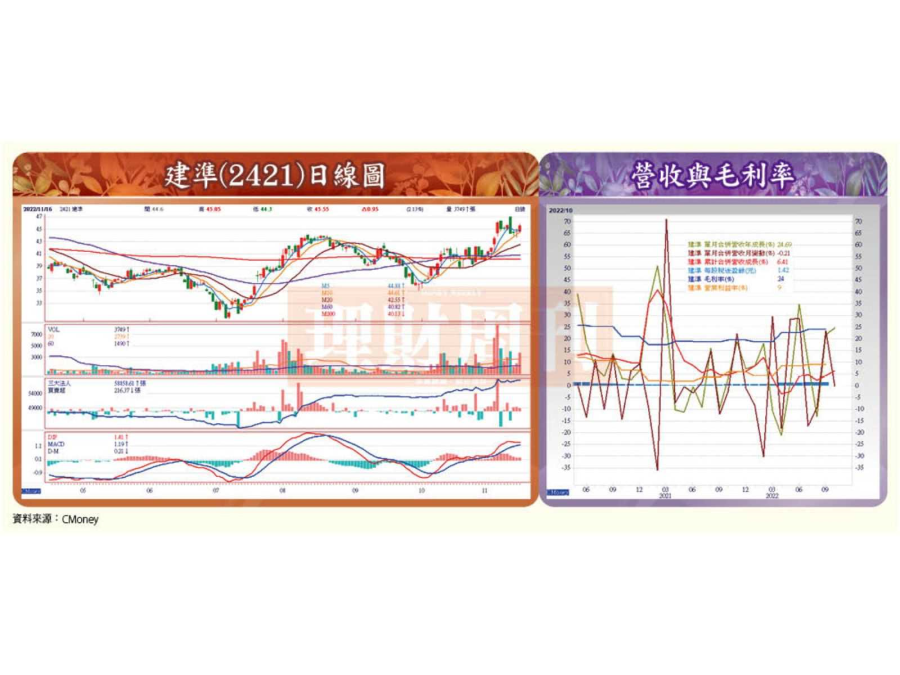 擺脫第二季的中國封城停工干擾影響,建準第三季營運已明顯回溫。因受惠車用、網通、伺服器訂單接單暢旺,建準第三季合併營收為三六.六四億元,季增率五.二○%,營業毛利則為八.七九億元,季增率一一.七八%,產品組合優化、新台幣兌美元匯率貶值助攻下,單季毛利率走高至二四%,季增一.四一個百分點,稅後盈餘為三.五五億元,季增率達一八.六六%,單季EPS一.四二元。