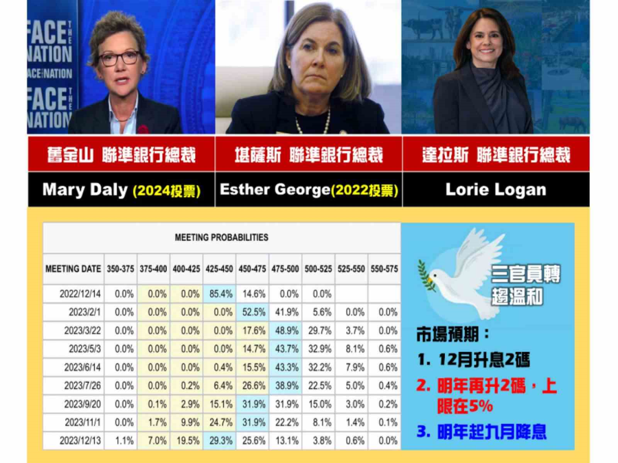 而美元與美債背後反映的,是美國三位FED官員談話的鷹中有鴿下,FedWatch對未來升息之路的預測(圖一)。樂觀結論是:年底最後一次升息應二碼,而明年總共再升二碼來到利率上限5%,而非CPI公布前恫嚇市場消費的6%,以及最快明年九月開始降息重回寬鬆之路。