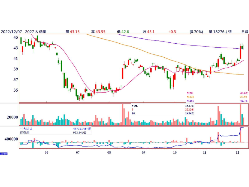 大成鋼近期被納入「高股息成分股」,外資三天大買近三萬張,推升股價三天大漲6.42%,目前股價站上年線42.7元呈多頭排列,同時也站上六個月底部(33~42元),有機會走出一波新的多頭行情。