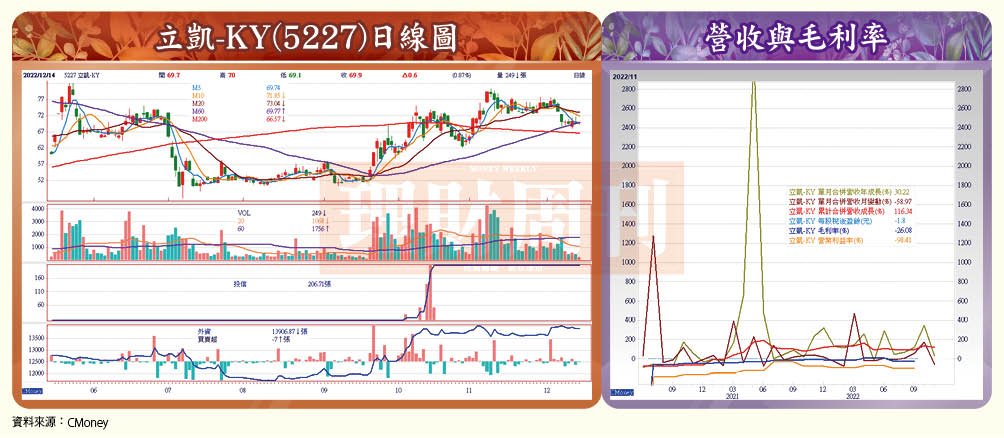 台灣磷酸鐵鋰電池正極材料大廠立凱-KY(5227),公告十一月營收○.六一億元,月增率負五八.九七%,年增率三○.二二%。累計今年一至十一月營收總額五.五四億元,年增率高達一一六.三四%。立凱-KY於電動車電池、儲能電池應用領域,提供LFP電池正極材料完整製造技術及相關專利,有助加速整體產業發展。