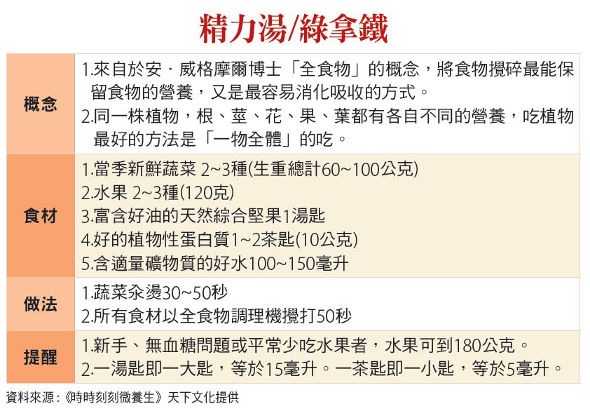 「健康的第一把鑰匙是飲食」,陳月卿說,先生喜歡大魚大肉,皮膚常有紅疹和疙瘩,都是身體急速排毒的現象,為了讓先生多攝取膳食纖維及植化素,她用蔬果、五穀、豆類、堅果等天然食材攪打成精力湯,一天一杯補充營養,方便身體吸收。