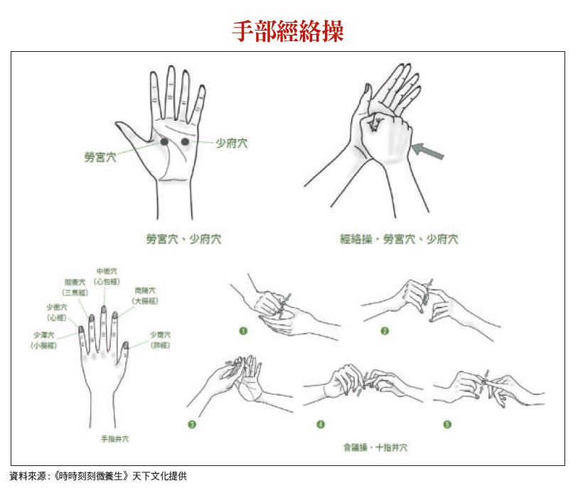 平常上班開會,老闆在台上講話,她會在底下悄悄地做手指經絡操,按摩掌心及手指,陳月卿說,每個手指尖都有穴道,如食指的商陽穴(肺經)可幫助消化、中指有中衝穴(心包經)提神醒腦、小指的少衝穴(心經)有益心臟等,手掌裡則有勞宮穴、少府穴,可以減緩疲勞、安定心神。