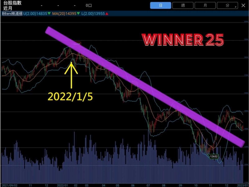 台股從2021年5月15日疫情進入三級警戒,正當大家以為股市要「完蛋了」,反而瘋狂上漲,一路漲到2022年1月5日創下歷史新高18619點後,開始往下墜跌了一整年,也讓台灣股市籠罩在下降壓力線(如附圖一紫色線段)之下,幾次反彈想衝破卻難以翻身,全台的經濟及整體大環境也陷入長期的低迷。