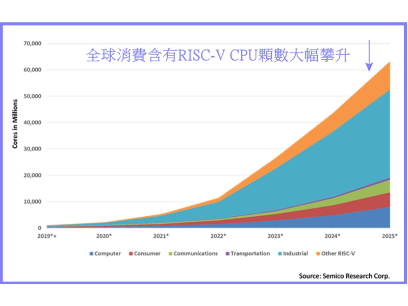 而更多開發者,才會選擇RISC-V陣營,該陣營又吸引更多參與者加入,形成增加迴圈。題外話,Android系統會迅速搶佔手機系統市佔率,靠的就是Google開放原始碼。你看,歷史是不是驚人的相似。根據調研機構Semico Research在2019年調查,RISC-V在2018~2025年年複合成長率以146.2%,席捲半導體市場(見圖一),足見其市場潛力。