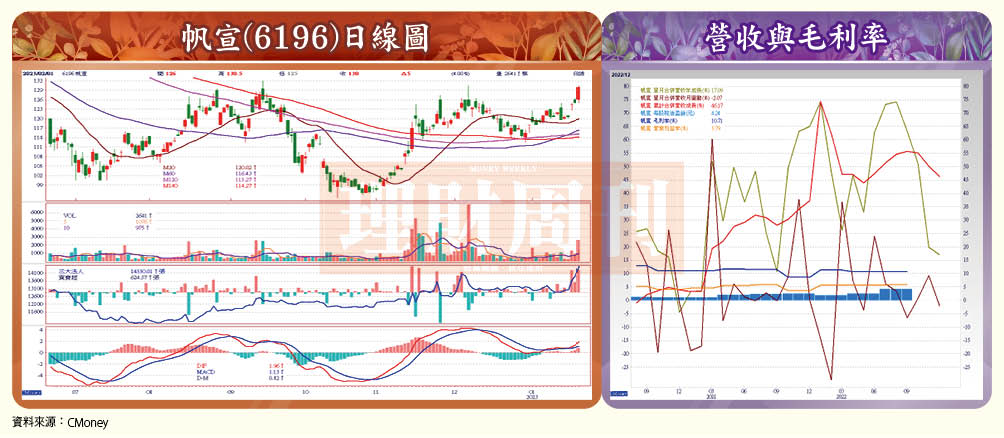 法人機構指出,帆宣目前不僅受惠客戶於美國興建新廠所帶動商機,同時,台積電規劃在台灣建立二奈米先進製程新廠,料將讓帆宣二○二三年在手訂單金額再度走高,而且,二○二四年在手訂單,也將因此有機會維持高檔水準。