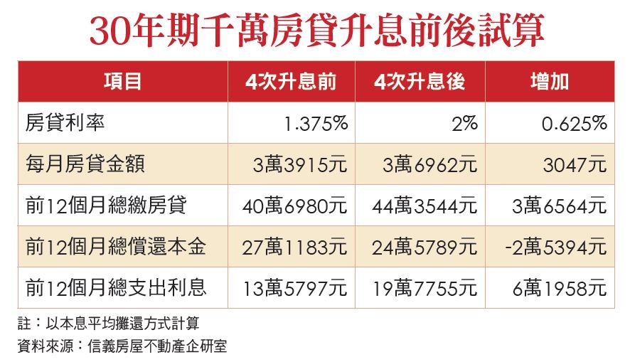 信義房屋不動產企研室專案經理曾敬德表示,以貸款1000萬元30年期本息平均攤還試算,央行去年四次升息前房貸利率1.375%,每月還款金額為3萬3915元,經歷四次升息後,則房貸利率會到2%,每月還款金額會增加到3萬6962元,較四次升息前每個月多出3047元,一年多出3萬6564元,等於多繳一個月的房貸(附表)。