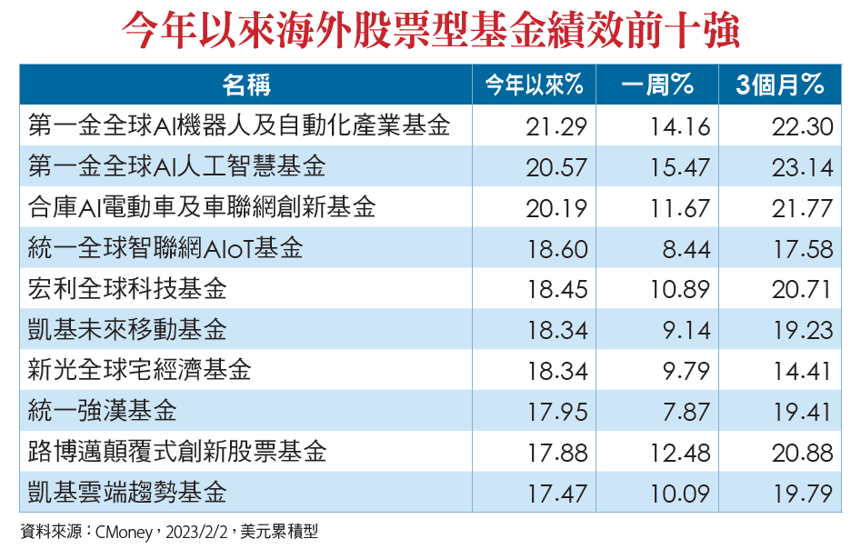第一金全球AI人工智慧基金經理人李坤憲指出,元月份在美國舉行的CES消費電子大展,出現了更多AI賦能的產品,例如AI烤箱、智能冰箱、自駕嬰兒車等,此外,人工智慧ChatGPT在今年伊始話題火紅發燒,讓AI主題有個亮眼的開局,半導體、自動化、電動車等相關產業更在這波題材性擴散傳遞下股價狂飆。