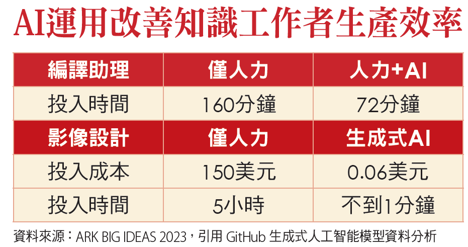 ARK《BIG IDEAS 2023》報告中指出,2022年是生成式AI元年,2023年則將掀起生成式AI運用風潮,包括ChatGPT等工具,將提高知識工作者生產效率,AI編譯運用可以節省一半的工作時間,對於影像生成的效率提升更為顯著(見附表),且在未來AI的機器訓練成本更呈現下降趨勢,第一金投信指出,這波AI人工智能新技術的發展運用,料將顯著反映在提升生產效率及降低投入成本等。