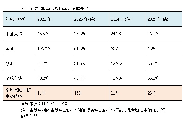《2023年全球電動車展望》報告估計,2022年全球電動車銷量達1,000萬輛,2023年將進一步成長至35%,達到1,400萬輛,電動車佔全球車市總銷量比率,也將從2020年的4%成長率,快速成長至2023年達18%,加上全球電動車行業,正吹起降價風,中國平價電動車興起,美國電動車新創大廠特斯拉,也有意推出新一代平價電動車,不惜以犧牲毛利率以擴大新車交付數,衝高市佔率,劉恆誌預估,全球快速成長的電動車產業,趨勢才正開始起頭,電動車背後,也將同時驅動綠色能源相關供應鏈爆炸式成長。