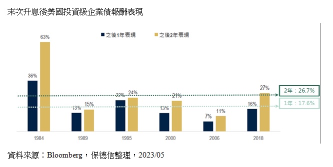 美國利率見頂後,市場預料今年底前有望見到聯準會降息3碼,激勵債市先行反應,保德信指出,這波美國快速升息推高殖利率後,投資級債市正逐漸撥雲見日,根據1983年以來共6次的升息經驗顯示,美國投資級債殖利率在末次升息見高點後進場,持有1年之平均報酬高達17.6%,若持有2年報酬更來到26.7%,且即便遇到衰退、利差擴大也都能守穩漲幅。