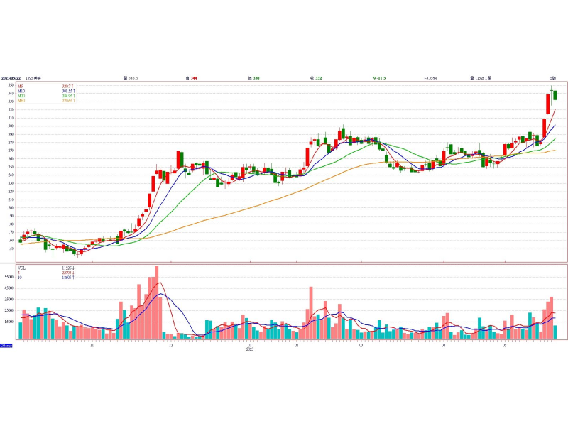 台股受美債上限談判仍無結果今日早盤呈現上下震盪走勢,生技醫療成為多頭資金避風港,由藥華藥(6446)、順藥(6535)領軍強攻下,類股強漲。專注學名藥廠美時(1795)受惠高毛利血癌藥的銷售成長,盤中股價最高上漲8元,法人近日已調高今年每股獲利5%至16.7元,按21倍本益比計,可上看350元。