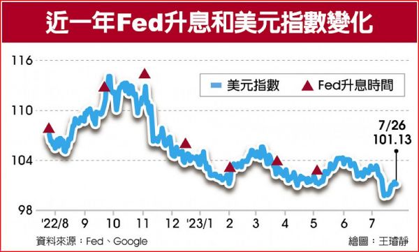 另一值得注意的現象是美元指數的表現。去年9月Fed第五次升息後,美元指數一度飆升至114.1,隨後升息效應遞減,指數逐漸滑落,7月中旬一度跌破100,7月26日才回升至101附近。