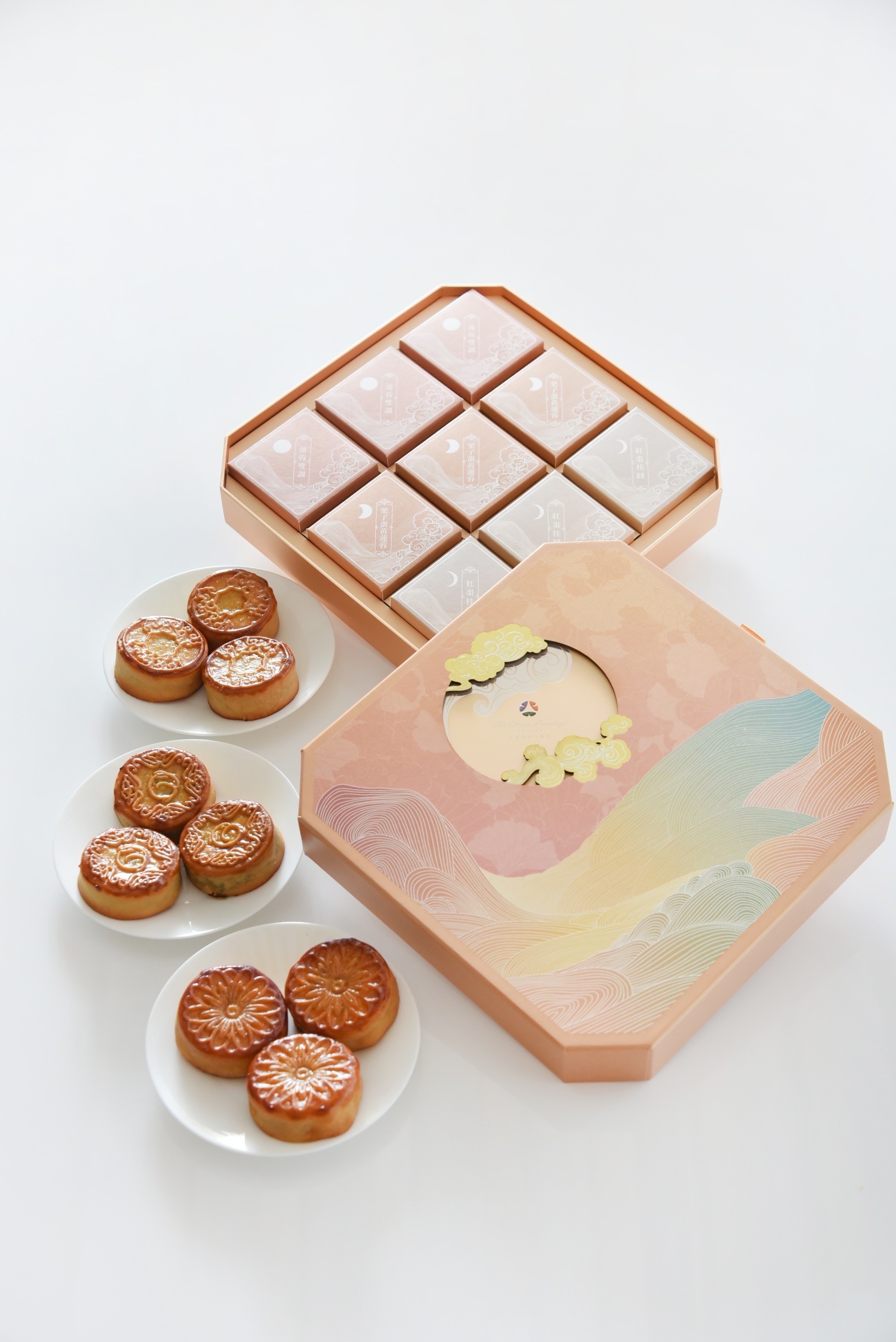 除了白玉東坡酥、焦糖光澤餅皮的琥珀蛋黃酥外,今年特地將台灣風味名菜「剝皮辣椒雞」融入月餅中,推出全新口味體驗,另外還有肉鬆麻糬、奶黃麻糬等台式口味,禮盒外觀設計融合典雅的仿木框造型,外盒再繪以台式窗花圖紋和幾何圖形,充滿濃厚的節慶氛圍,掀開盒蓋,還可以讓消費者寫下祝福話語,傳遞心意。