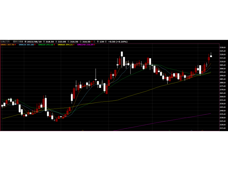 在股價方面,瓦城股價突破盤整區間,均線呈現多頭排列,8/9收316元,漲幅3.44%,今(8/10)開盤318.5元,盤中漲幅1.9%。法人預估今年每股盈餘為14.82元,年增約309%,相應的本益比約21。雖然成交量目前較低,但投資者可繼續關注後續的表現。