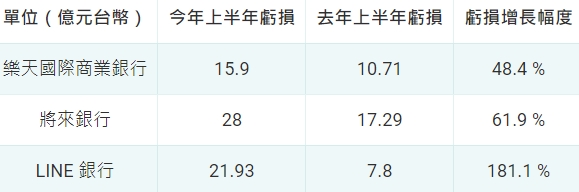 其中,以 LINE 銀行的虧損幅度增長率最驚人,將近兩倍;將來銀行則是連續二年榮登上半年虧損冠軍。