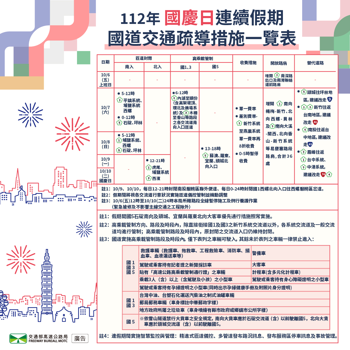 國慶連假,許多人會選擇出外遊玩,不過要提醒大家,高公局針對連假期間有祭出疏運措施,包括匝道封閉、高乘載管制、暫停收費等,這些管制措施有可能會對駕駛者的出行產生影響,因此建議在出行前查看實時交通信息,以避免造成不便。