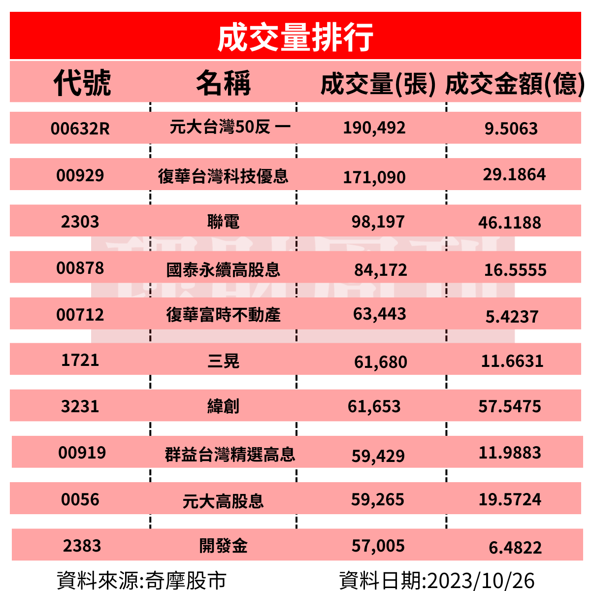 在成交量排行前十名中,其中包含六家ETF,分別是元大台灣50反1(00632R)、復華台灣科技優息(00929)、國泰永續高股息(00878)、復華富時不動產(00712)、群益台灣精選高息(00919)、元大台灣高股息證券投資信託基金(0056),其中特別之處在於00632R與00712。