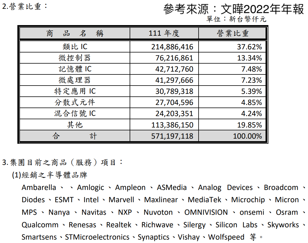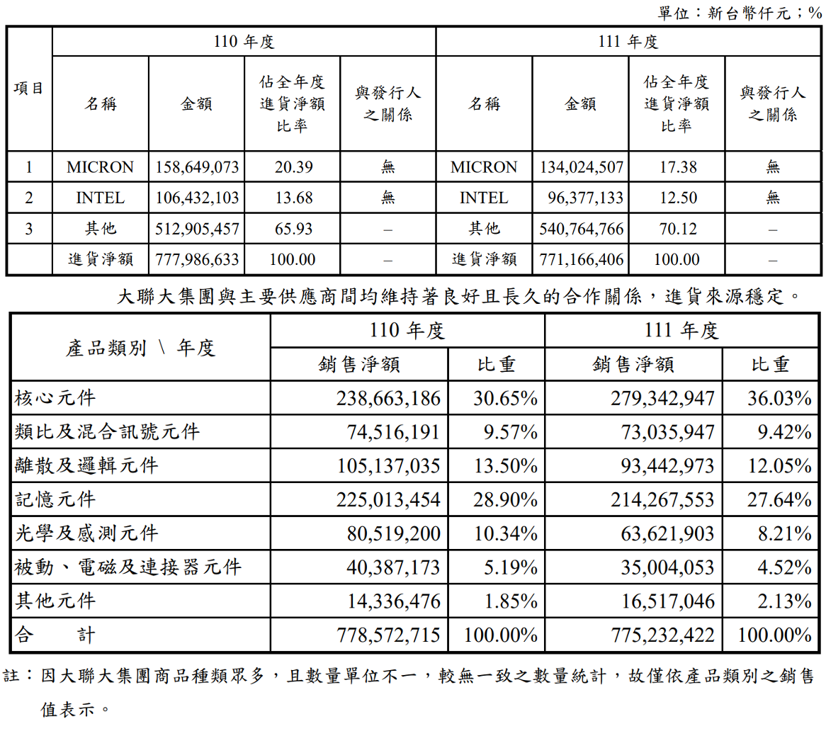 大聯大集團真的很「大」,還記得之前很夯的海運股嗎?大聯大也轉投資海運為主的台驊投控,甚至持股8%也派人進入董事會。回到公司本身觀察,從年報可以發現大聯大主力代理產品來自美光(MICRON)及英特爾(INTEL),旗下代理或經銷之元件也非常多元,整體上以IC通路為主,原因是大聯大過去是由國內IC通路龍頭世平及第三大的品佳合併,目前當然還是國內IC通路商龍頭。大聯大經過這數十年的連續併購之後,現在已經是全球及亞太最大的半導體零組件通路商,集團品牌擁有世平、品佳、詮鼎及友尚集團,代理產品供應商超過250家,這產業規模及品項,真的沒在跟你開玩笑,所以如果你想知道美光跟英特爾的狀況,除了看他們美國財報之外,你也可以看看大聯大的近況,自然會有答案。