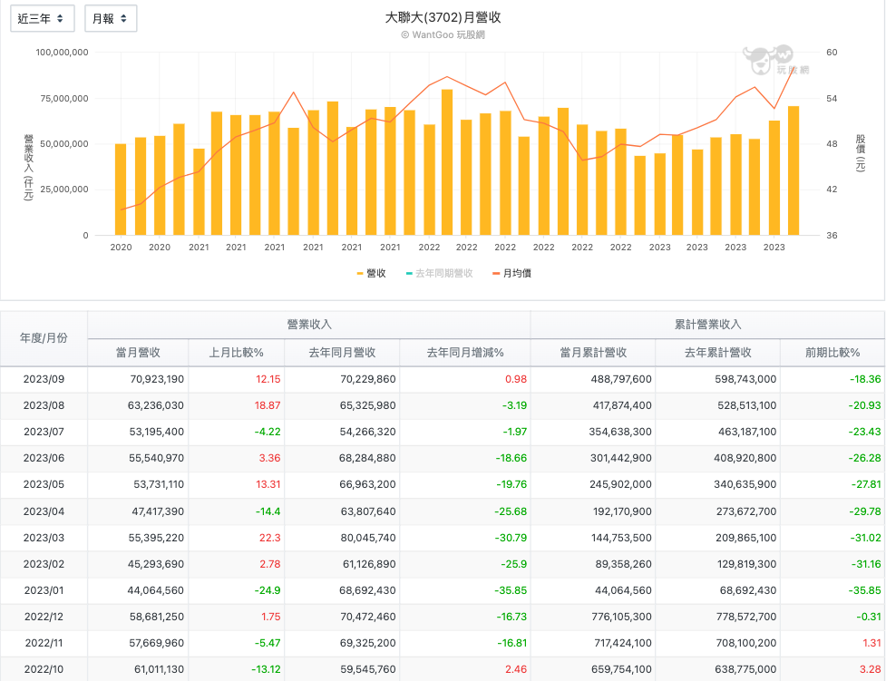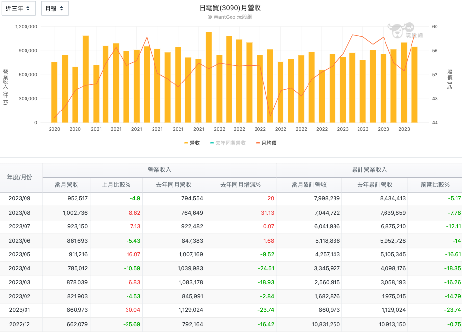 一樣看營收表現,2022年日電貿營收年減0.75%,2023年前三季營收年減5.17%,這衰退程度並不像其他電子產業,而最近全球積層陶瓷電容龍頭村田也看好手機市場復甦,認為進入第四季的需求即將反彈,所以被動元件需求也會轉強。如果再從近期營收表現來看,2023年六月營收出現全年首度年增,來到九月已經連創四個月的年增,這也可以看出產業利多開始反映在日電貿的業績,而且也不用擔心國巨或華新科的震盪或虧損,這投資風險自然相對比較低一些。