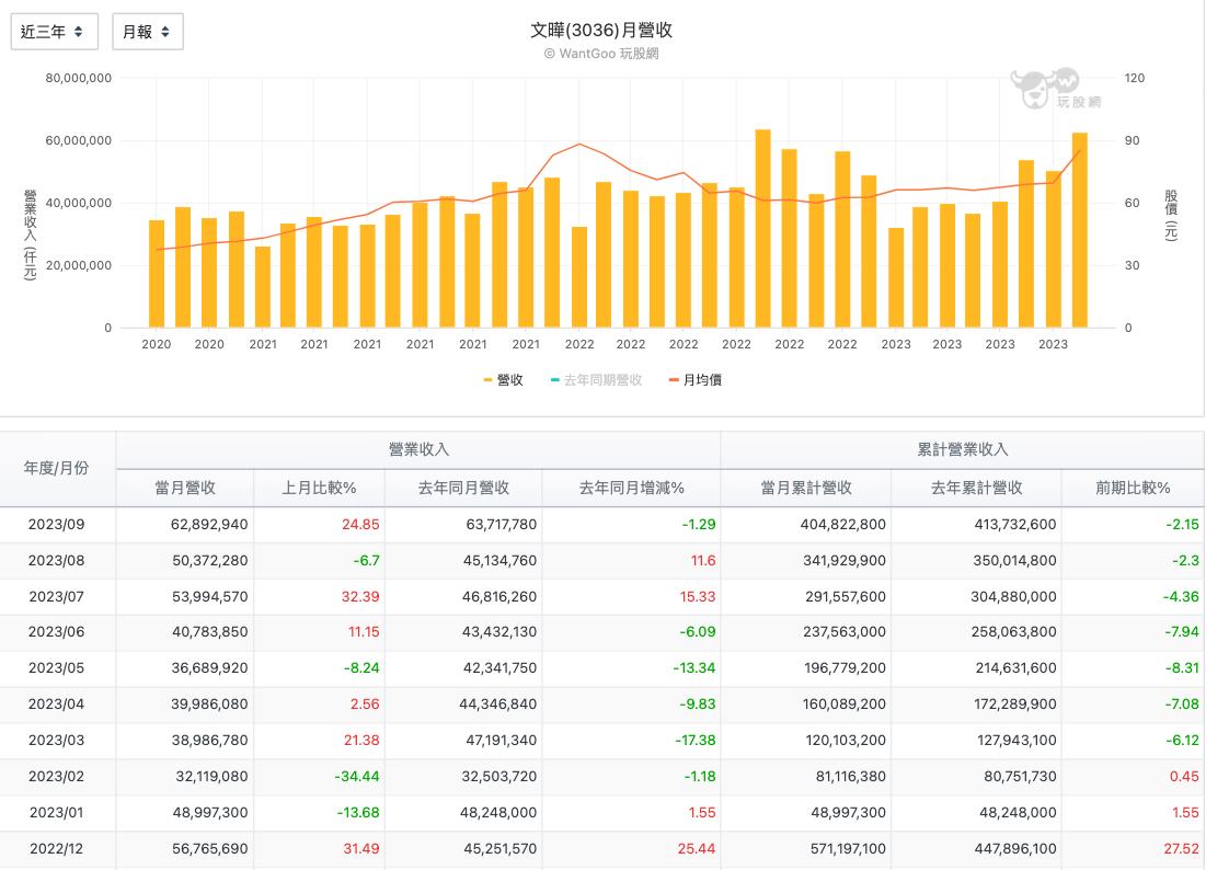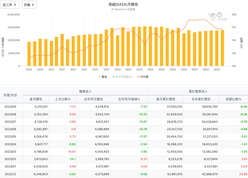 一樣看營收,就知道業績好不好,既然都說到崇越主力客戶是台積電,那麼半導體景氣當然也會出現在崇越身上,2022年全年累計營收是年增23.88%,12月則衰退0.58%,其實這也同樣是先盛後衰的狀況。如果再看到2023年的狀況,前三季累計營收衰退6.46%,這衰退幅度僅個位數,而單月營收從五月到八月都衰退超過10%以上,但九月份收斂至個位數的衰退,從這一點不難看出台積電大聯盟供應鏈果然還是不一樣,明明一票同業都已經衰退到不成人形,結果崇越衰退似乎不僅「慢半拍」,而且最新營收居然又默默創下連續五個月的月增,抗衰退表現相當不錯。