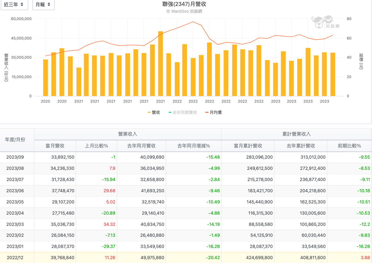 聯強一樣直接看營收,2022年營收是年增3.88%,但12月單月衰退超過兩成,這就表示聯強獲利是先盛後衰。來到2023年依舊疲弱,前三季累計營收為年減9.55%,但有個特別的地方是聯強衰退並未擴大,因為每個月的累計營收大概僅衰退10%左右。前面資料已經清楚能看到,賣電腦、手機是聯強的主力,換句話來說,聯強在消費性電子產品還在走弱的時間點,衰退也不像電子公司動輒衰退到腰斬,這就是我說的「代理通路商」特質,反正他們只不過是業績轉弱而已,而且聯強衰退維持在10%附近而沒有持續擴大,那麼接下來只要撐到景氣復甦,要重返成長就很快了。