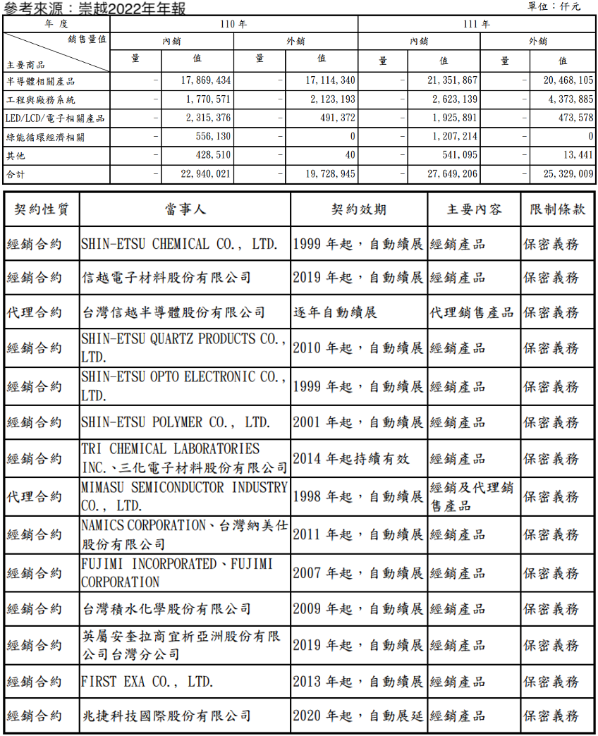 說到崇越,你可能查新聞只會看到老闆郭智輝整天說要打棒球,不然就是看到他說要努力經營健康超市,讓大家吃得更安全,反而忘了他本業是代理商。但如果從投資角度來看,崇越最強之處在於代理信越幾乎是旗下半導體全品項的產品了,所以與其知道崇越是誰,你要先認識信越是誰。信越旗下最知名的是矽晶圓及光阻劑,這兩項明星產品都是全球產業龍頭,台積電也都使用信越旗下的各種產品,所以台積電宣布2022年優良供應商卓越表現獎得主,當然也包含信越。延伸到台灣崇越,你就可以很清楚知道,當台積電要使用信越產品時,只要在台灣,當然就要透過崇越才能買到,而且崇越旗下公司也找了信越入股,所以信越當然也不可能傻到把崇越換掉,這就是拿石頭砸自己的腳。